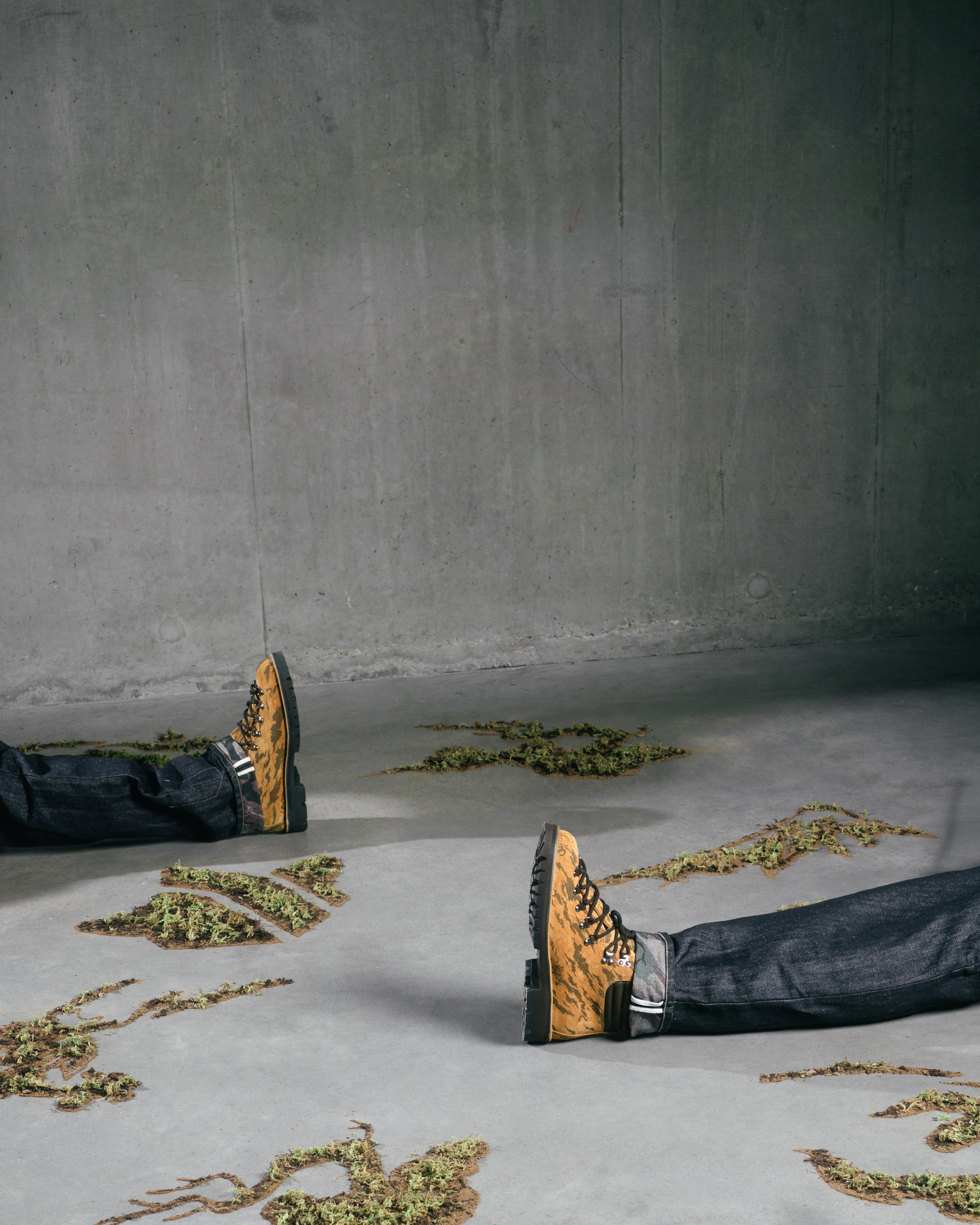 Through subtle applications or by revealing camo within the interiors of garments, as with the Japanese hemp-denim jeans in this shoot, Maha reframes the pattern as one of nature, art, and peaceful subversion. Instead of concealing the wearer for conflict, Maha’s camo serves as an artistic exploration, quietly inverting its traditional purpose.