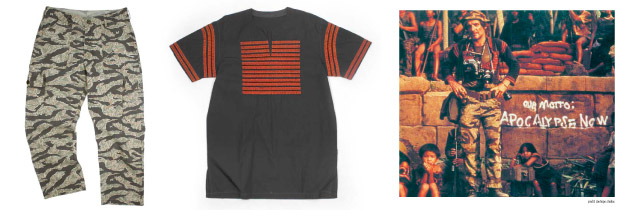 Of all the camouflage patterns, tigerstripe is probably the most instantly recognizable and visually attractive design there is. Produced in South-East Asia during the Vietnam war in a variety of versions, it was initially issued to US Army Special Forces troops who valued its functionality and concealment properties in jungle environments, and regarded it as a kind of status symbol. Later, tigerstripe suits became available from local tailor shops, and were privately purchased by other personnel – pilots, reporters, photographers etc – as a distinctive and fashionable alternative to the standard olive-green uniform. Tigerstripe has also gained notoriety in popular culture, being worn by Dennis Hopper’s photojournalist character in Apocalypse Now, and on stage by Joe Strummer.