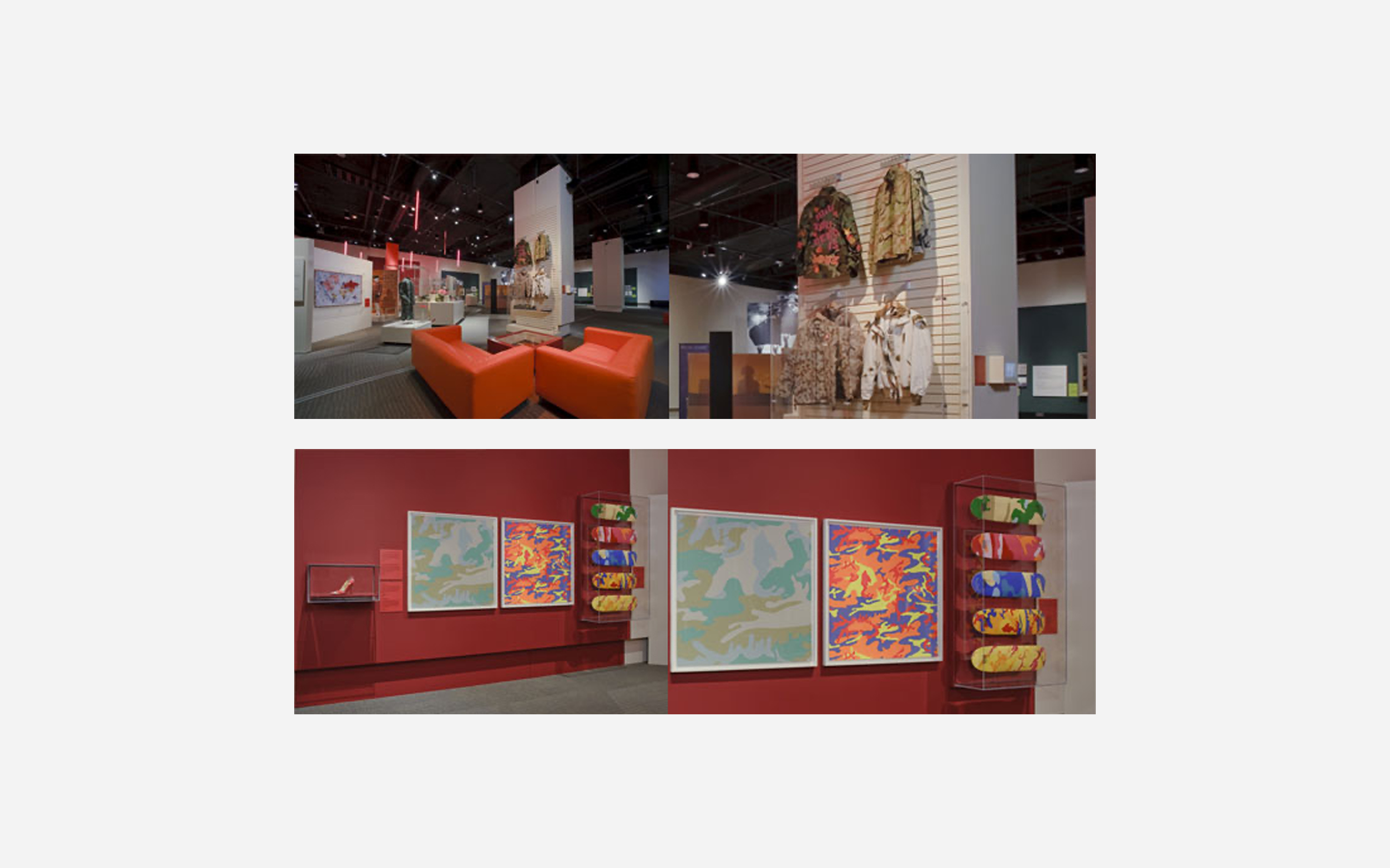 The exhibition includes camouflage bikinis, stiletto shoes, DPM Series 2 Andy Warhol skateboards by Maharishi, recycled military jackets by Maharishi, evening dresses by Jean Paul Gaultier and head-wear by Philip Treacy, as well as Hardy Blechman’s DPM : Mappa embroidered tapestry...
