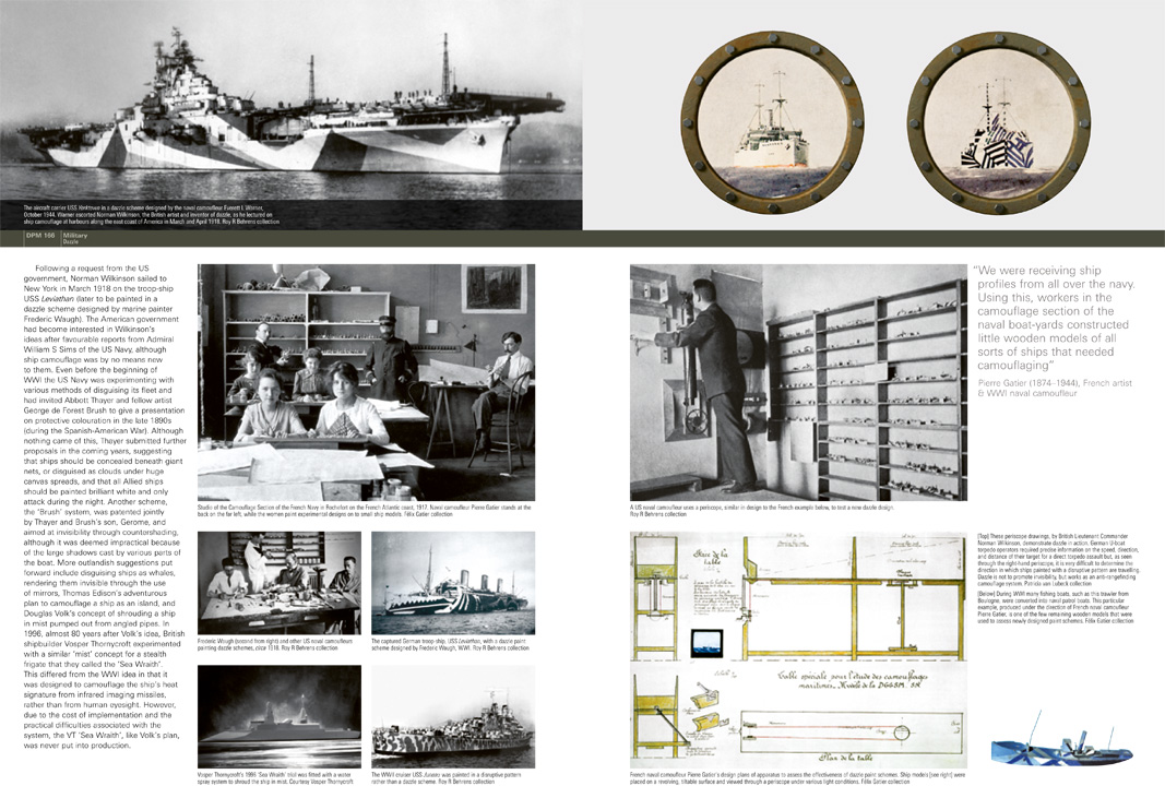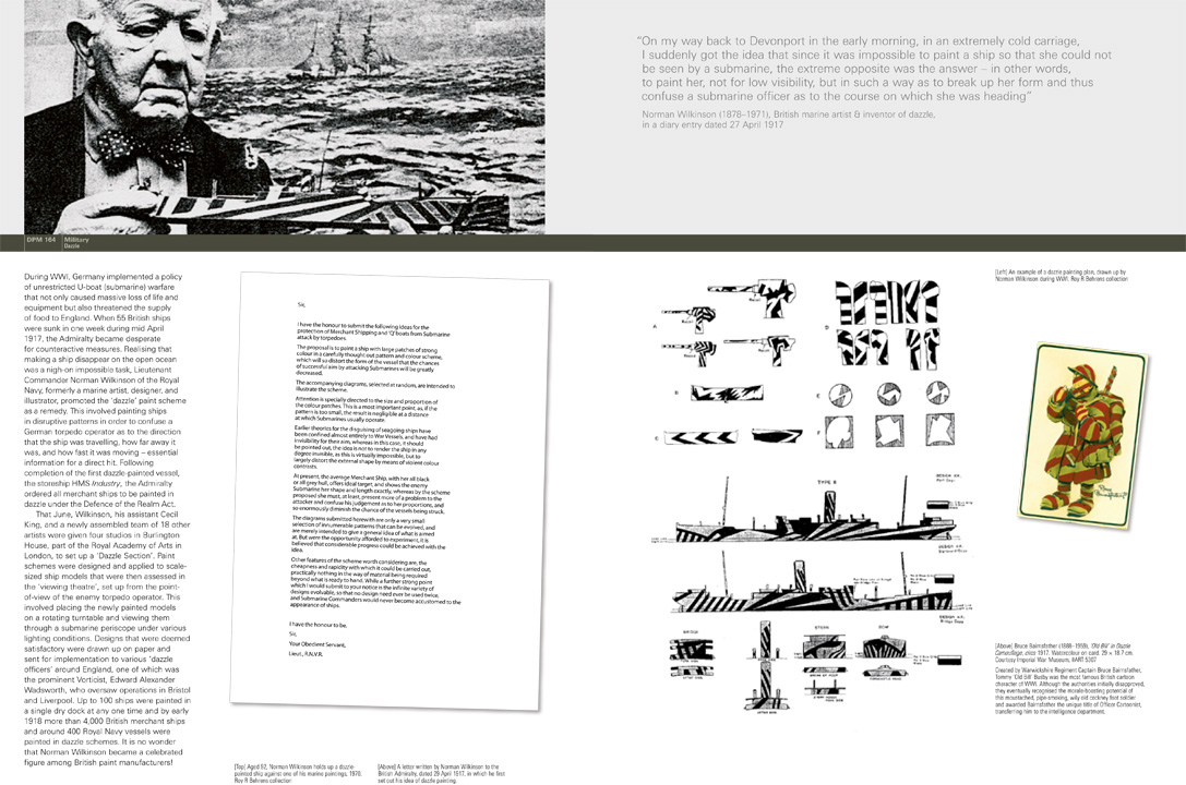 During WWI, Germany implemented a policy of unrestricted U-boat (submarine) warfare that not only caused massive loss of life and equipment but also threatened the supply of food to England. When 55 British ships were sunk in one week during mid April 1917, the Admiralty became desperate for counteractive measures. Realising that making a ship disappear on the open ocean was a nigh-on impossible task, Lieutenant Commander Norman Wilkinson of the Royal Navy, formerly a marine artist, designer, and illustrator, promoted the ‘dazzle’ paint scheme as a remedy. This involved painting ships in disruptive patterns in order to confuse a German torpedo operator as to the direction that the ship was travelling, how far away it was, and how fast it was moving – essential information for a direct hit. Following completion of the first dazzle-painted vessel, the storeship HMS Industry, the Admiralty ordered all merchant ships to be painted in dazzle under the Defence of the Realm Act.