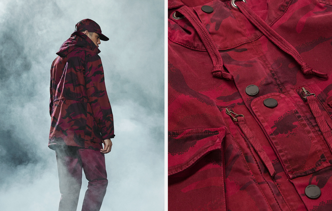For the first time maharishi has stretched the camo graphic – further enforcing the elements and mimicking natural wood grain texture. The stretched scale is reminiscent of the spiral and interlocked patterns that occur naturally in trees. Many of the camouflage styles are fully reversible, allowing the pattern to be worn internally.